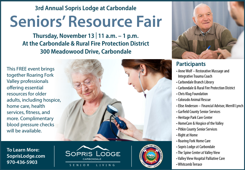 Join C.A.R.E. on Thursday, November 13 at the Carbondale & Rural Fire Protection District for the 3rd annual Seniors’ Resource Fair, hosted by the Fire Department and Sopris
